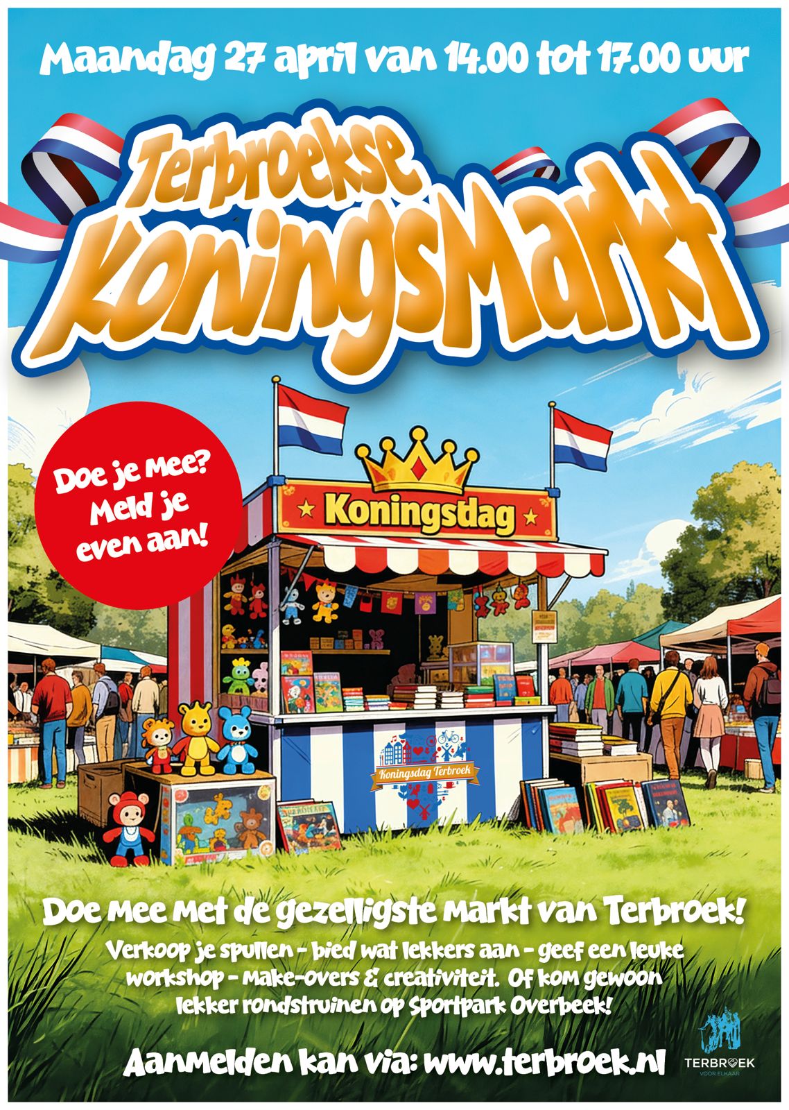 Op Koningsdag verandert Terbroek in een bruisende en vrolijke vrijmarkt! Van 14.00 tot 17.00 uur organiseren we de Terbroekse Koningsmarkt: een middag vol plezier, creativiteit en gezelligheid voor de hele buurt.